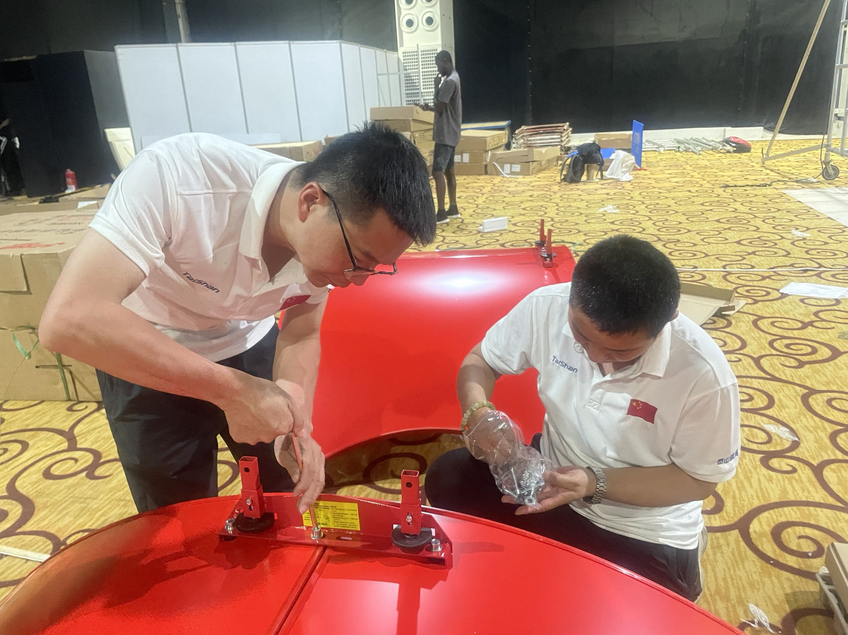 作为全球体育健康一站式解决方案服务商,凯发体育服务保障团队是一支不可或缺的重要力量,赛事服务保障团队既包括产品设计、研发技术人员,也包括制造、生产、集成、服务人员,对每一款产品的研发、生产、性能都了如指掌,形成了从产品研发到下线的全流程闭环跟踪服务模式。目前,非运会凯发体育器材正在紧张有序的安装中,服务保障团队发扬一丝不苟、精益求精、注重细节、环环相扣的敬业精神,在器材组装、调试工作中,不放过那怕一颗螺丝和微小部件,保障每一件器材的使用性能都达到最优状态。